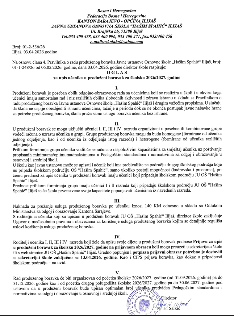 Uredno popunjen i potpisan prijavni obrazac potrebno je dostaviti u sekretarijat škole zaključno sa 13.04.2026. godine. Kao u CIPS prijavu boravka, kao dokaz pripradnosti školskom području – na uvid.
